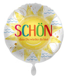 "Schön, dass Du wieder da bist" wünscht dir dieser glückliche Ballon Schön dass du wieder da bist! Der Ballon ist 45cm groß und hat ein schönes Sonnen-Motiv mit Wellen im Hintergrund.