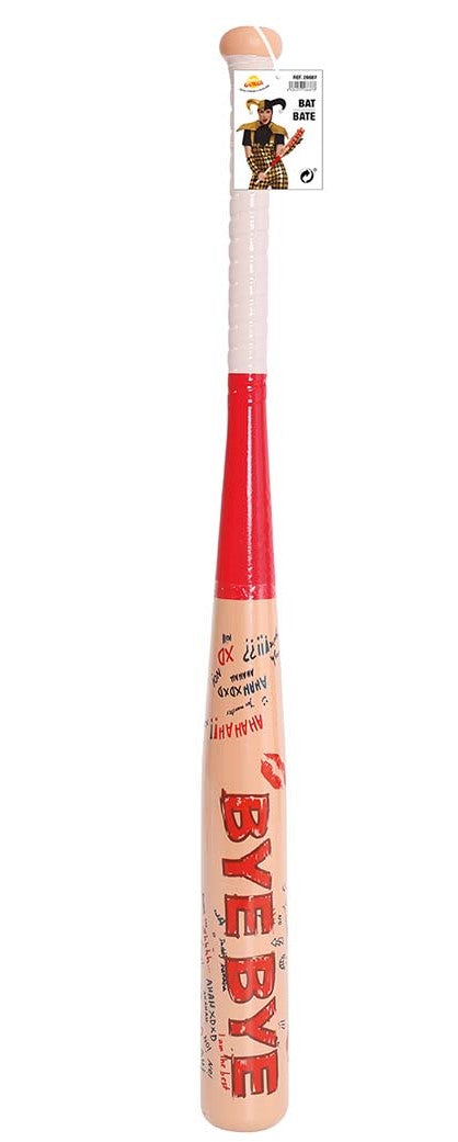 Der Baseballschläger Bye Bye hat eine Größe von 73cm x 6cm x 6cm und ist ideal für Halloween oder für andere gruselige Kostümpartys geeignet.