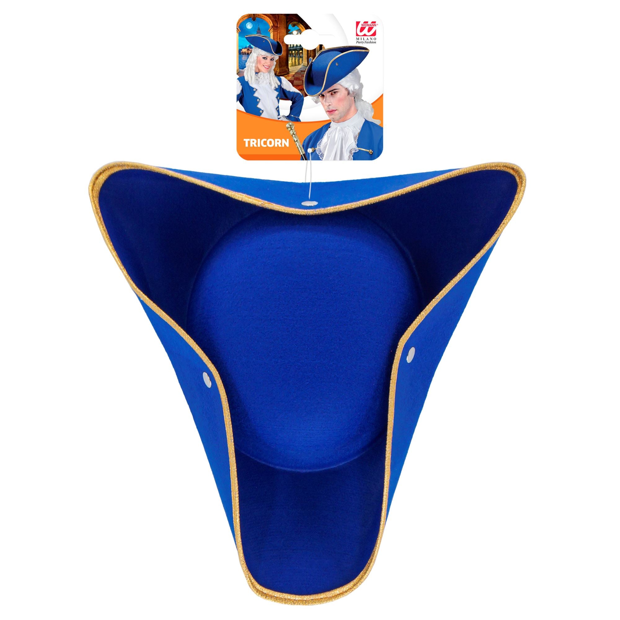 Der blaue Musketier Dreispitz Hut ist ein unverzichtbares Accessoire für jeden Piraten! Der Hut mit der goldenen Umrandung ist auch für bestens für die Garde, das Funkenmariechen oder historische Kostüme geeignet.