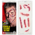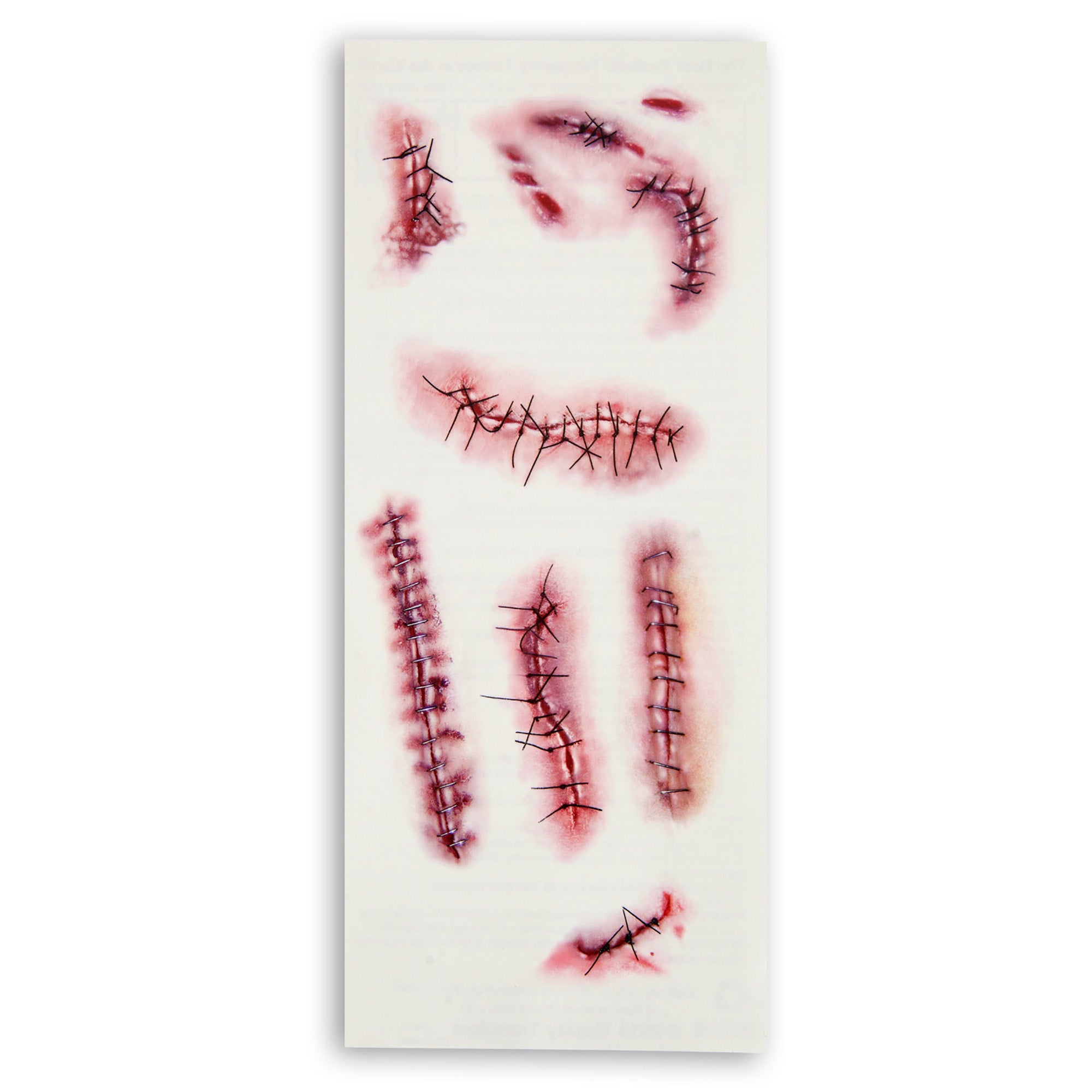 Die blutigen Narben Tattoos mit 10 unterschiedlichen Motiven sind ein absolutes Must Have für die nächste Halloween Mottoparty. Die einzelnen Nähte - entweder genäht oder geklammert - sehen täuschend echt aus und lassen jeden erschauern. Sie passen zu vielerlei Halloween Kostümen oder auch zum Outfit eines Boxers oder Schlägers.