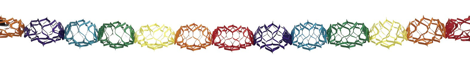 Diese 4m lange bunte Regenbogen Fiesta Papier Girlande ist ein farbenfroher Hingucker auf jeder Party. Die Waben-Girlande sorgt für fröhliche Stimmung durch die kunterbunte Optik. Ideal für alle Anlässe und Mottos!