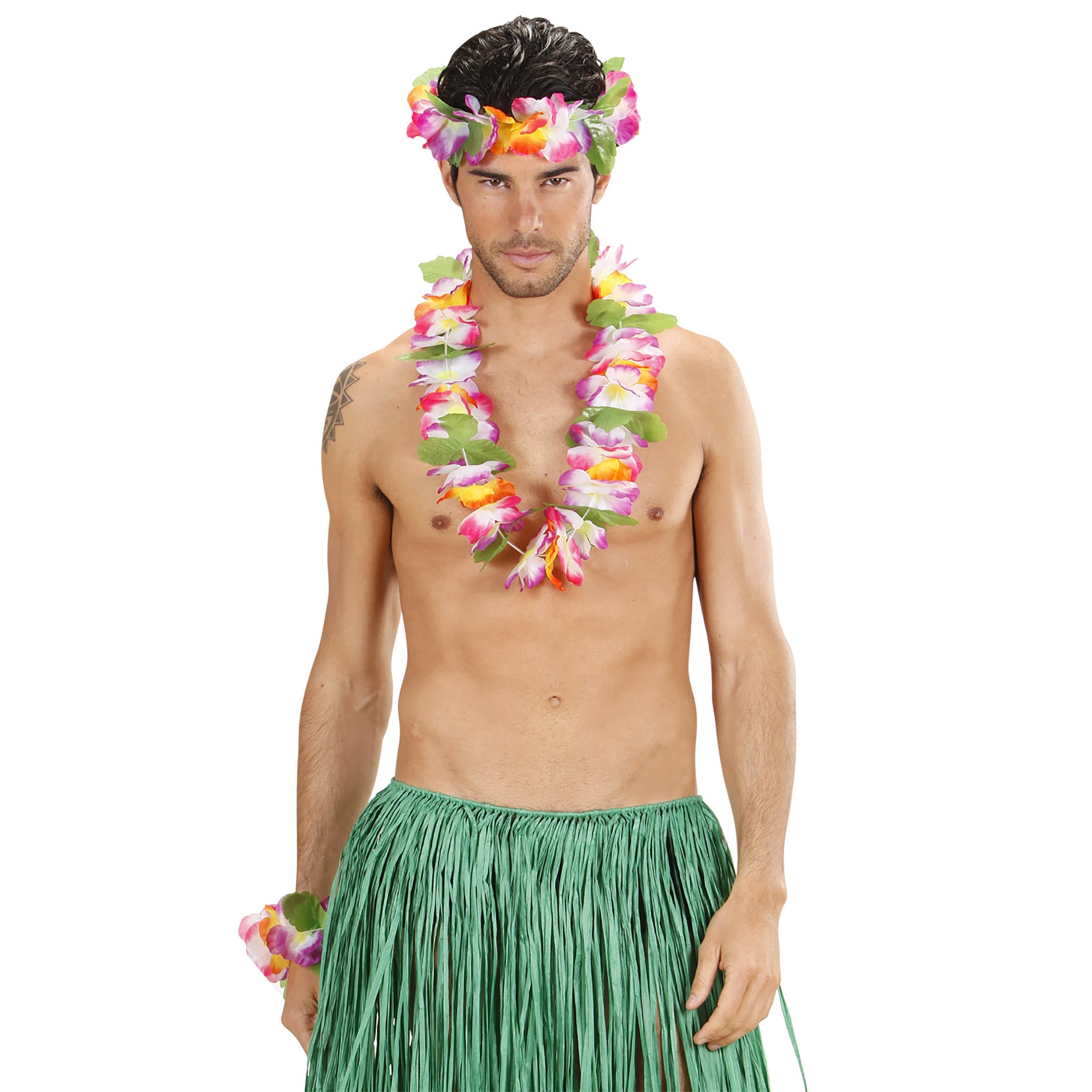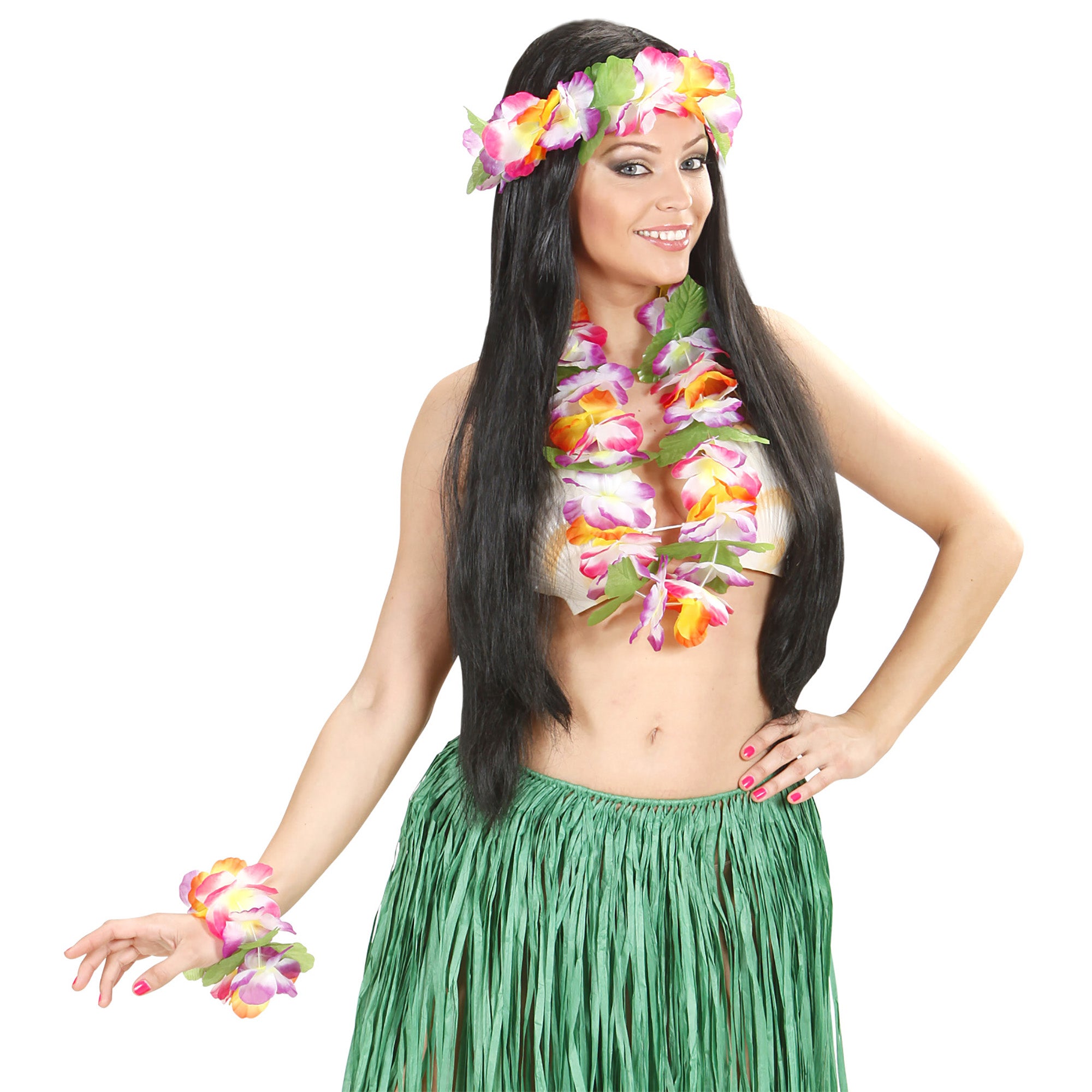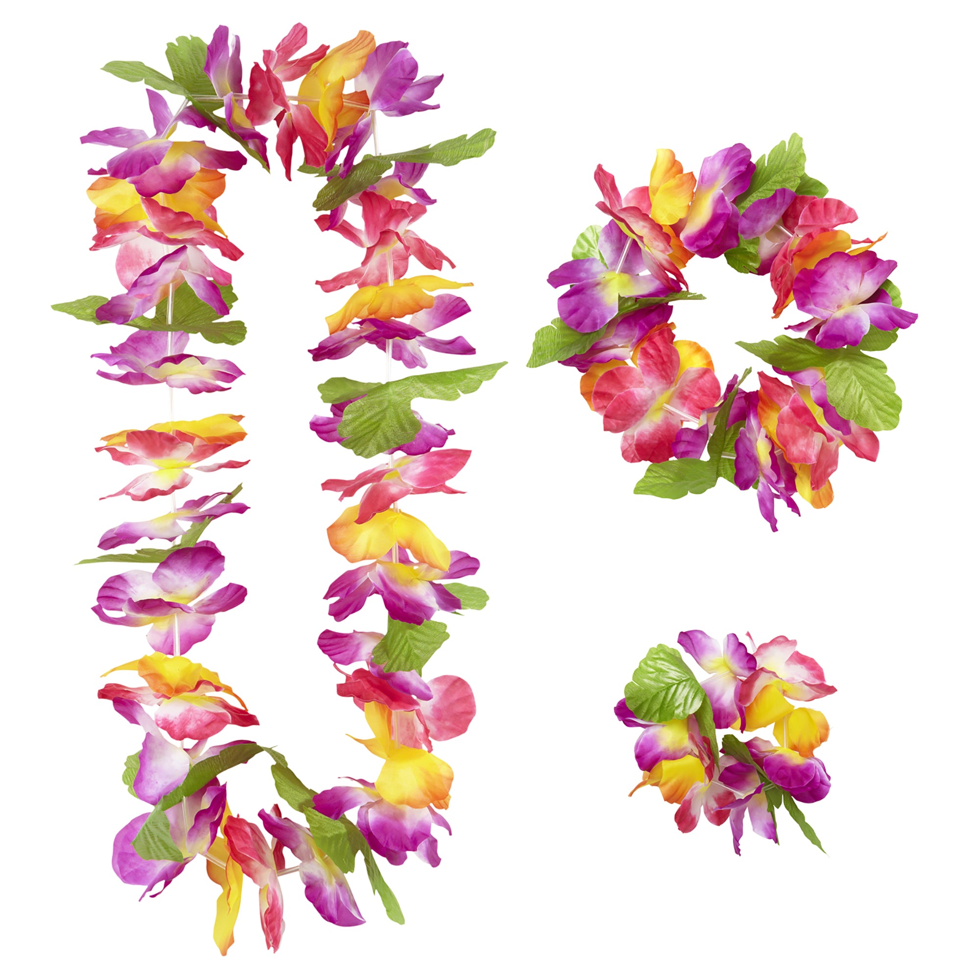 Ein tropischer Blütentraum, so sieht unser Buntes Hawaii Schmuck Set aus. Das Set besteht aus Halskette, Haarkranz und Armband. Werde zum Hula Girl und lass deine Inselträume wahr werden.