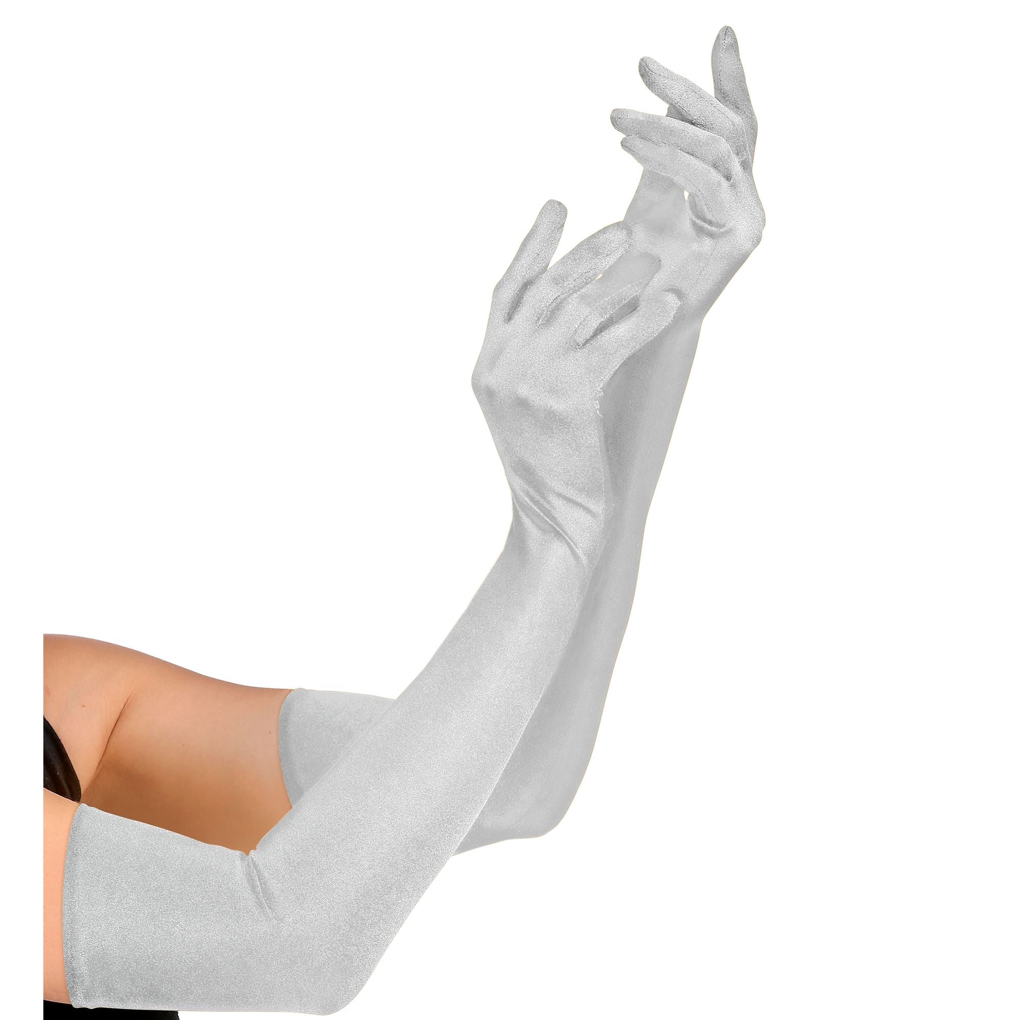 Die Damen Handschuhe in Silber verleihen diversen Kostümierungen einen eleganten Touch. Passend für 20er Jahre Kostüme sind die 60cm langen Handschmeichler.