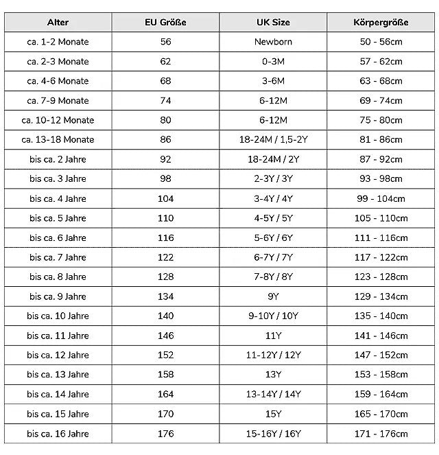 | Größe | Körpergröße (cm) A | Taillenumf. (cm) C | Lebensalter in Jahren |