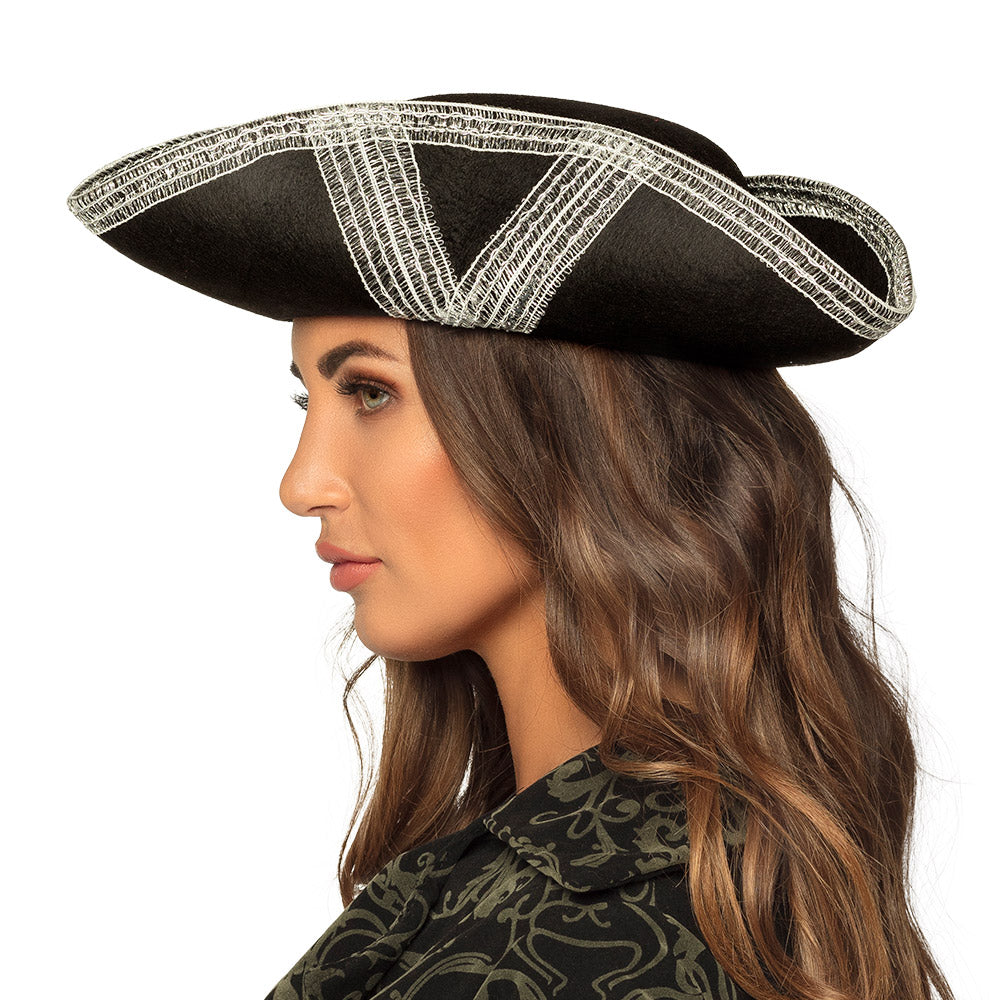 Der edle Damen Piratenhut in Silber-Schwarz ist eine tolle Ergänzung für alle Piraten Kostüme. Der Hut hat die typische Dreiecks Form und ist mit silbernen Nähten verziert.