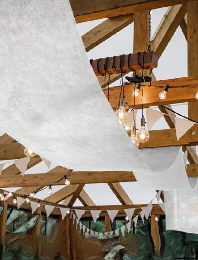 Die einfarbige Stoffbahn in Weiß verwandelt jeden noch so langweiligen Raum in einen eleganten und romantischen Saal. Über Balken gehangen, oder mit Schnüren befestigt, lenkt der 80cm breite und 25m lange Stoff von allen unschönen Begebenheiten ab und bietet stattdessen einen atemberaubenden Blickfang. Mit weiterer farblich abgestimmter Dekoration, wie Lampions oder Pompons, kannst du im Handumdrehen deinen Farbcode in der kompletten Location umsetzen.