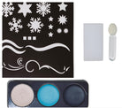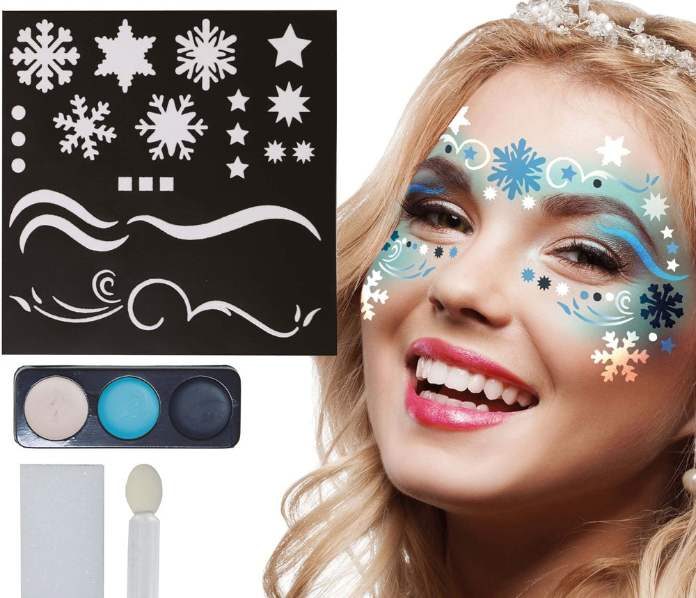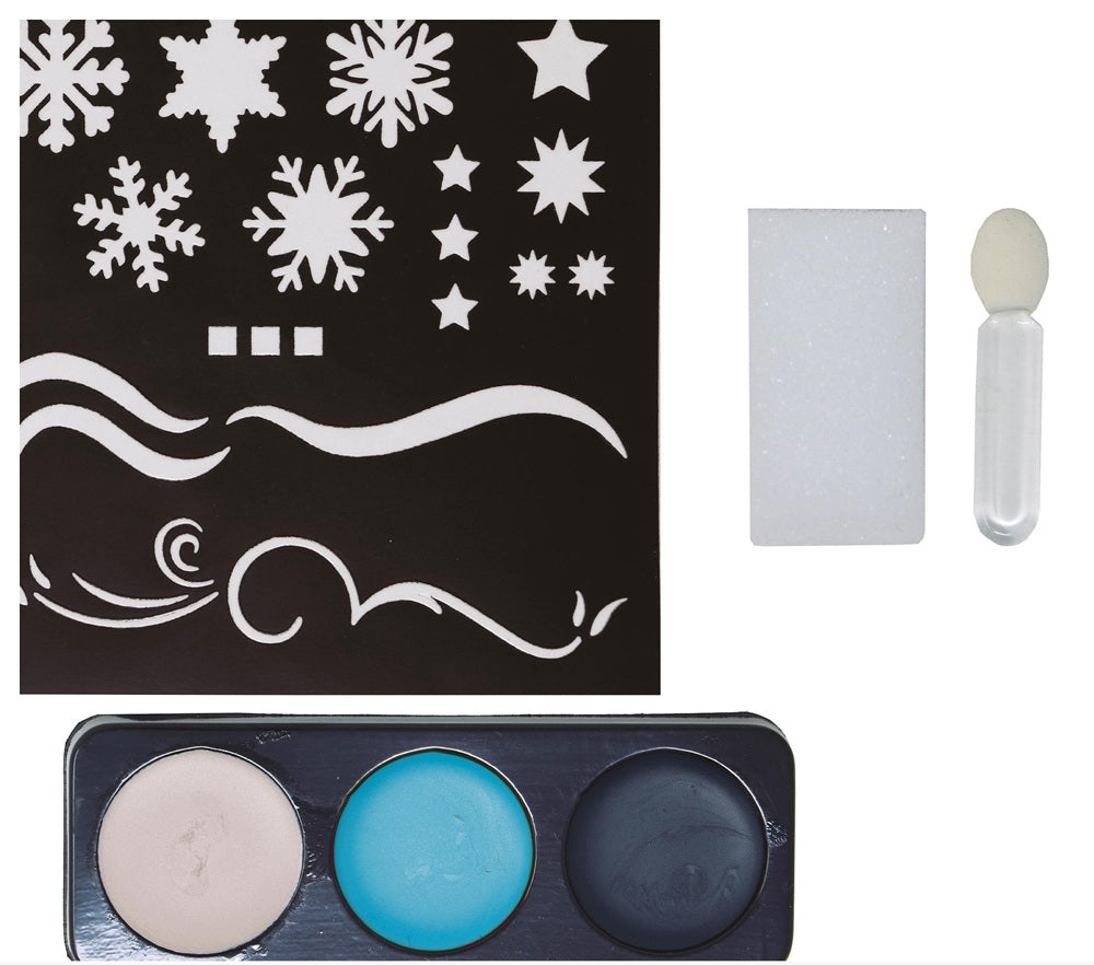 Das Eiskönigin Schneeflocken Make-up Set Deluxe beinhaltet einen Satz Farbe, Pinsel, Schwamm sowie eine Schablone.