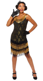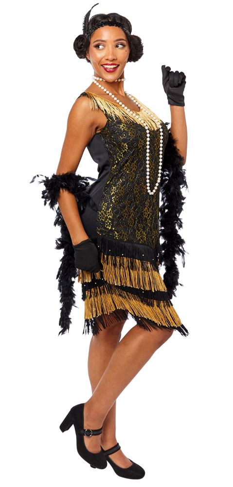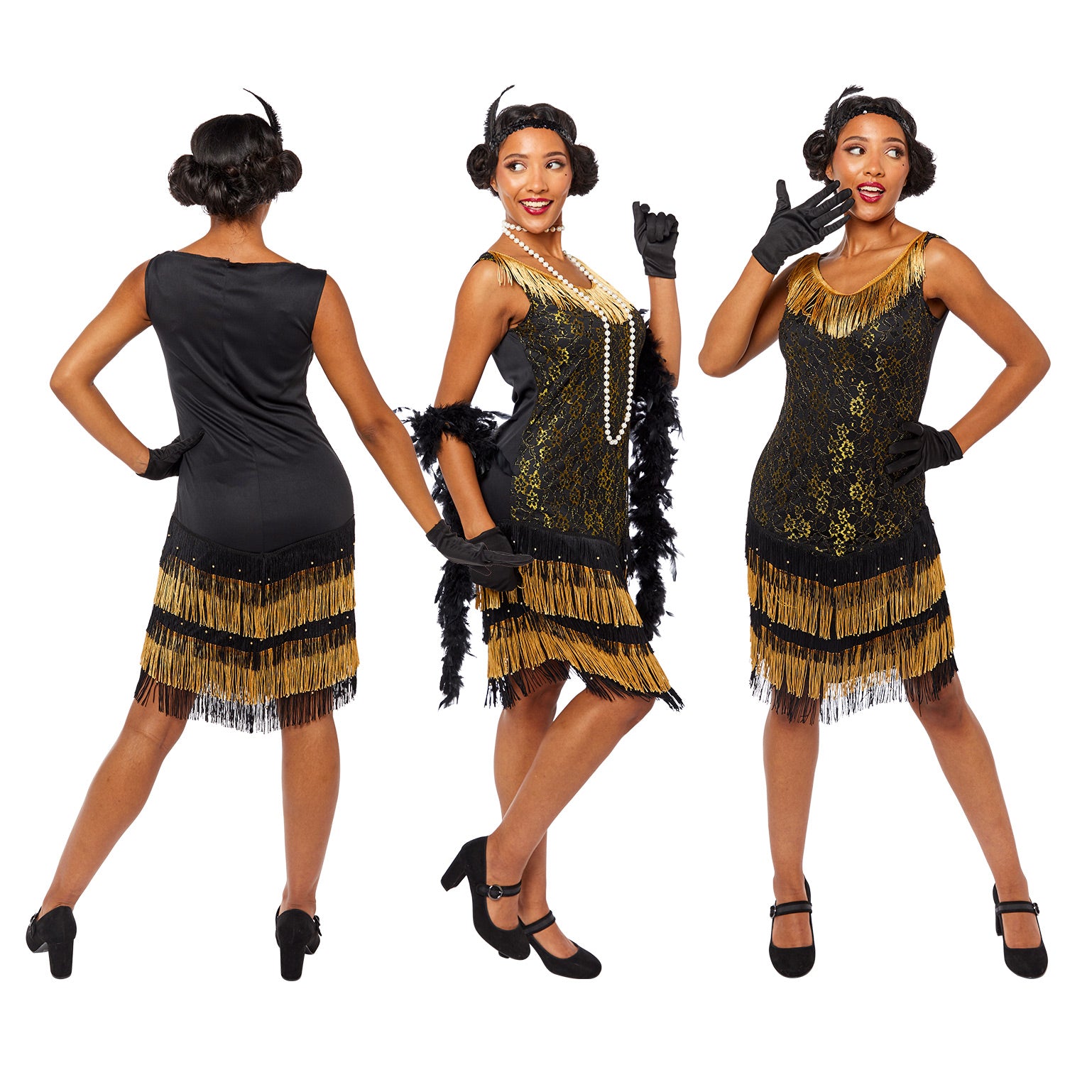 Bereit für Glitzer, Glamour und pompöse Partys? Mit dem eleganten Charleston Kleid in Schwarz wirst du im Handumdrehen zurück in die Goldenen 20er versetzt. Das knielange Kleid ist mit goldenen Details verziert und hat am Dekolleté sowie am Saum Fransen, die bei jeder Bewegung hin und her schwingen. Ideal für Karneval-, Fasching- und Motto-Partys.