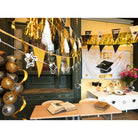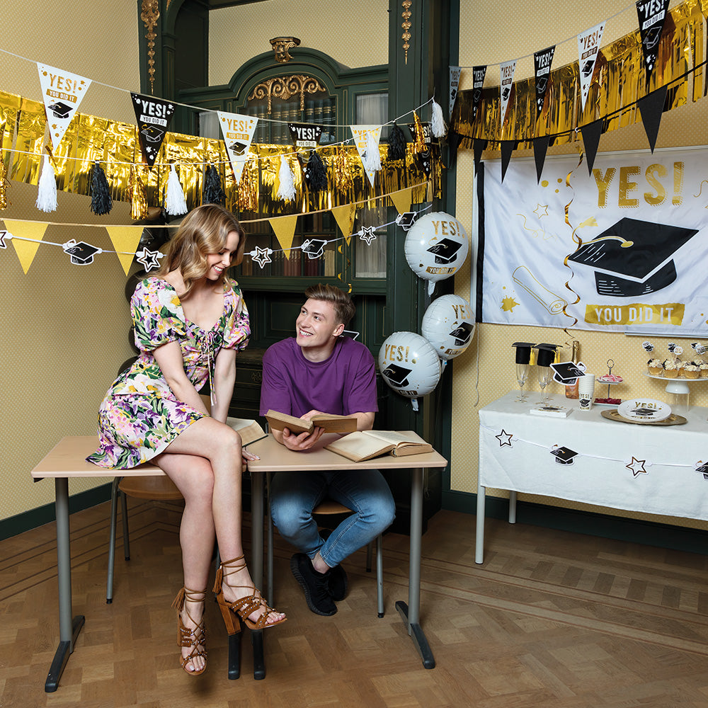Mach dein Ereignis einzigartig mit der Fahne Graduation Glam. Mit ihren 1,5 m Länge und 90 cm Breite ist sie ideal, um deinen Erfolg hervorzuheben und alle deine Gäste zu beeindrucken.