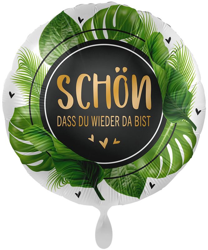 Dieser Folienballon Welcome Back ist 43cm groß und in schickem Design gehalten. Mit natürlichen Blättern im Hintergrund und edler goldener Aufschrift "Schön, dass du wieder da bist" ist dies der perfekte Welcome back Ballon!