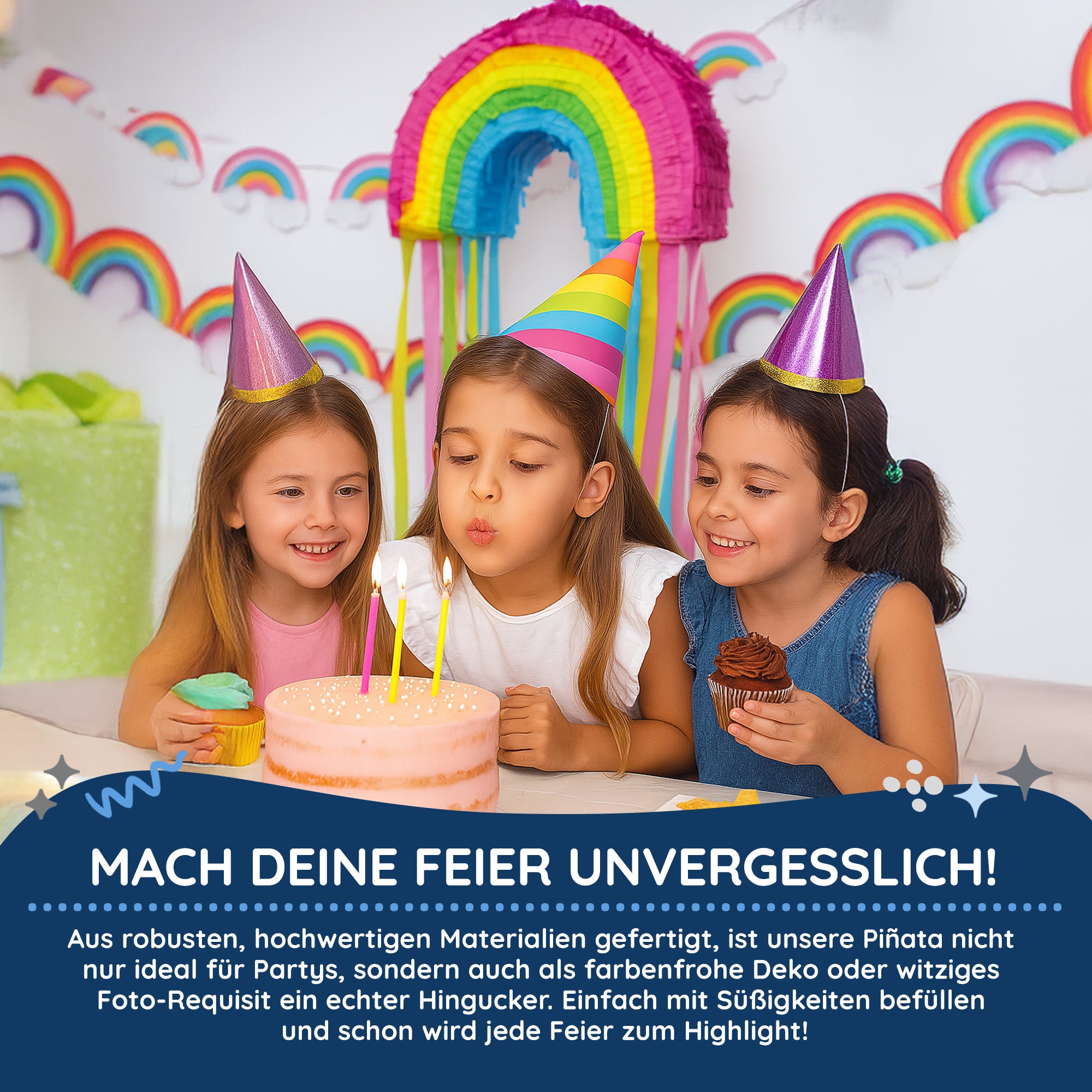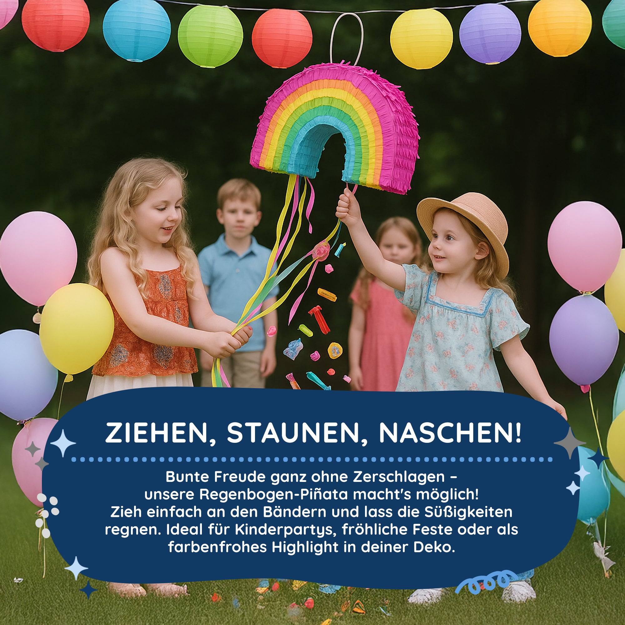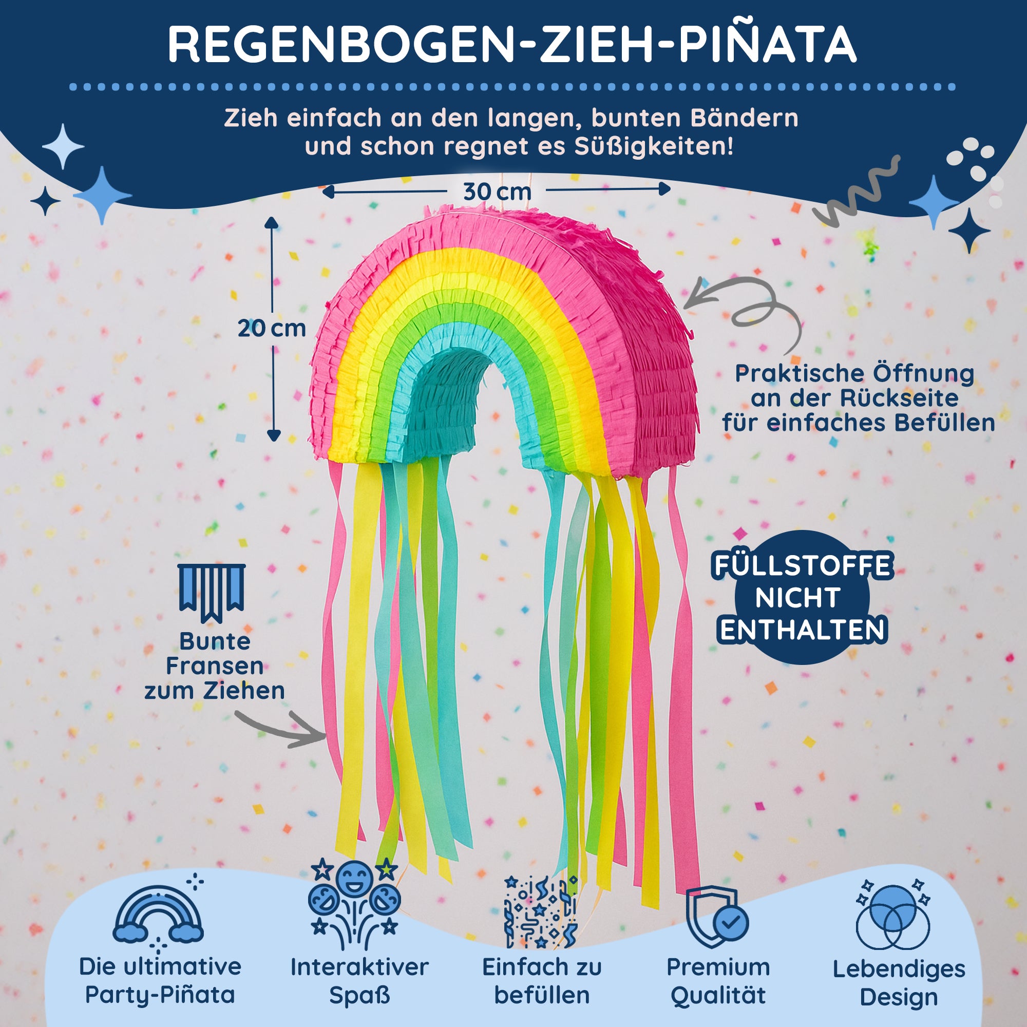 Viva Pinata! Mit der Fransen Regenbogen Zieh-Piñata holst du dir ein kleines Stück Regenbogen auf deine Party und begeisterst so deine Gäste. Die süße Zieh-Piñata hat die Maße 30 x 20 x 10cm, eine tolle Farbgebung, und garantiert dir und deinen Gästen viel Spaß. Um sie mit Süßigkeiten zu befüllen, befindet sich an der Oberseite eine markierte Öffnung. Dank einer weißen Plastikschlaufe kannst du die Piñata an den gewünschten Platz hängen. Da es sich um eine Zieh-Piñata handelt, muss sie nicht zerschlagen werden, sondern lediglich an den langen rosafarbenen Bändern gezogen werden, um sie zu öffnen.