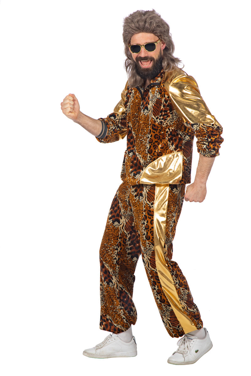 Der Glam Assi Trainingsanzug für Herren ist ein optisches Highlight und ein Muss für jeden prolligen Fan der beliebten Sportanzüge. Dieser zweiteilige Trainingsanzug besticht durch seinen Tiger Print und seine goldenen Details, mit denen hier nicht gespart wurde. Wir empfehlen hierzu dringend eine Vokuhila Perücke! Eine tolle Verkleidung für Karneval, Fasching und Mottopartys!