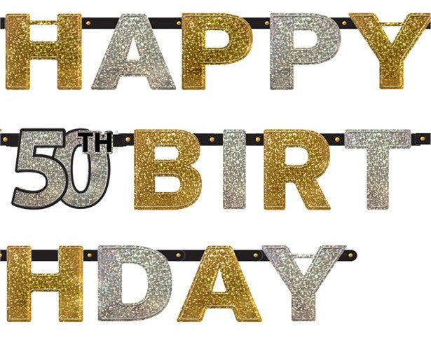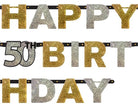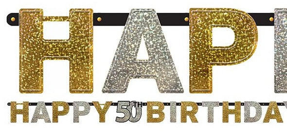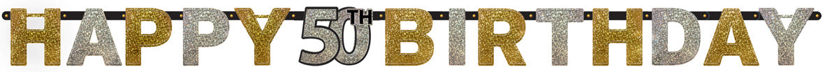 Eine funkelnde Girlande, die dem Anlass würdig ist! Die Golden 50th Birthday Girlande ist mit einer Länge von 2,13m und einer Breite von 16,2cm ein glitzernder Hingucker in strahlendem Silber und Gold.