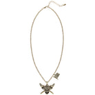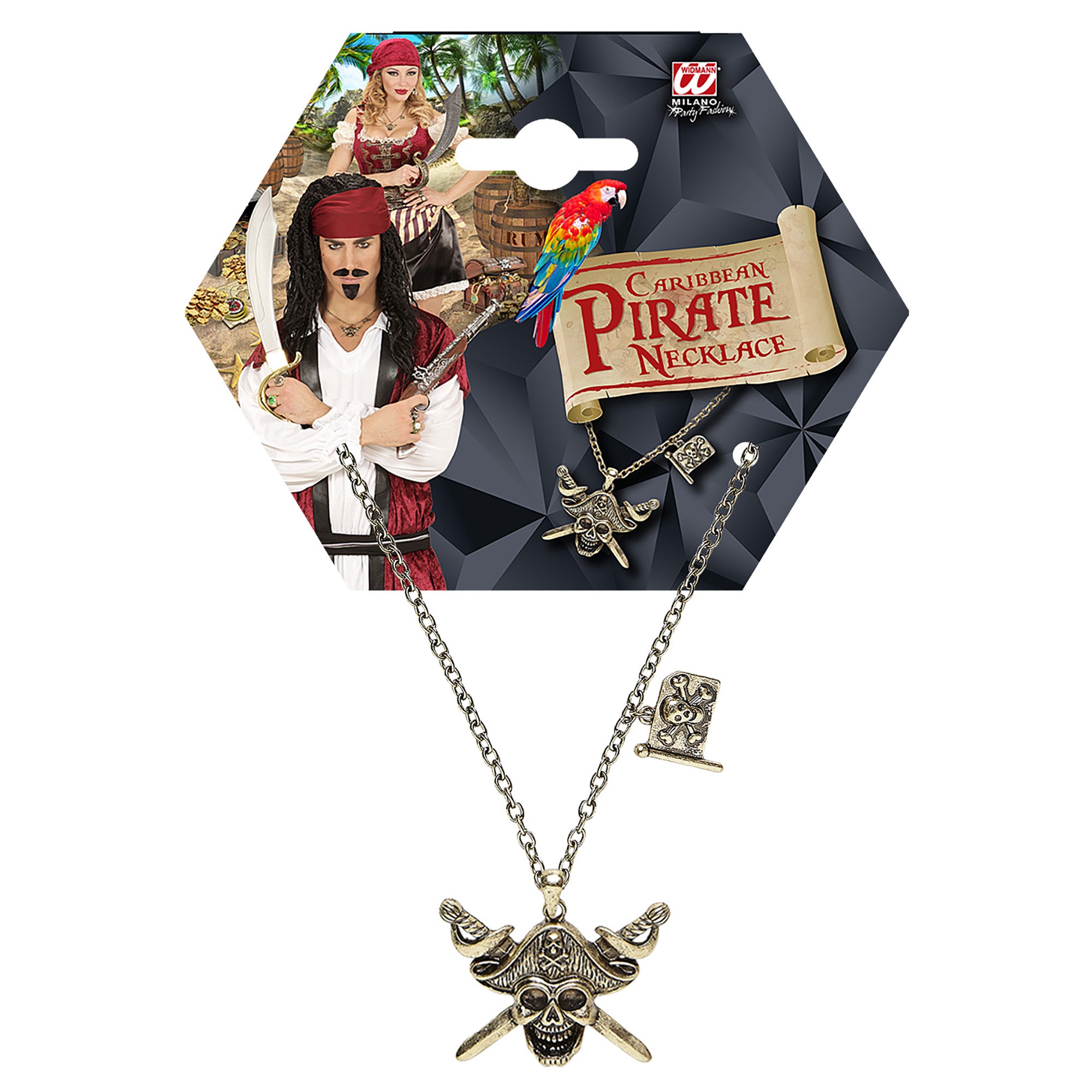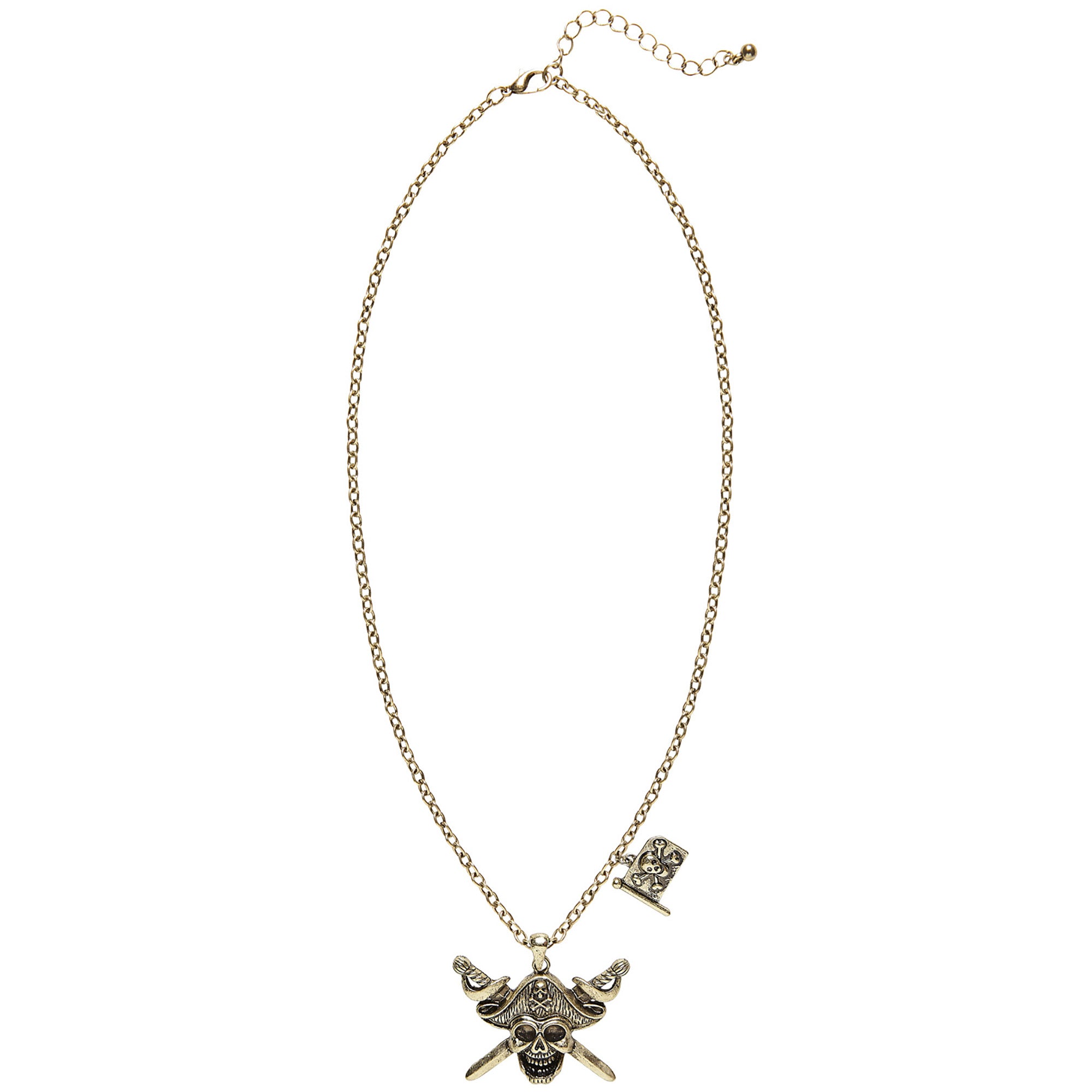 Die goldene Halskette mit Piratenanhängern ist ein unverzichtbares Accessoire für viele Piraten Kostümierungen! Die goldfarbene Metallkette für Erwachsene ist verstellbar und hat 2 Anhänger. Der eine Anhänger zeigt einen Piratentotenkopf mit Hut und 2 gekreuzten Säbeln, der Andere hat die Form einer Piratenflagge und ist etwas kleiner.