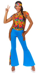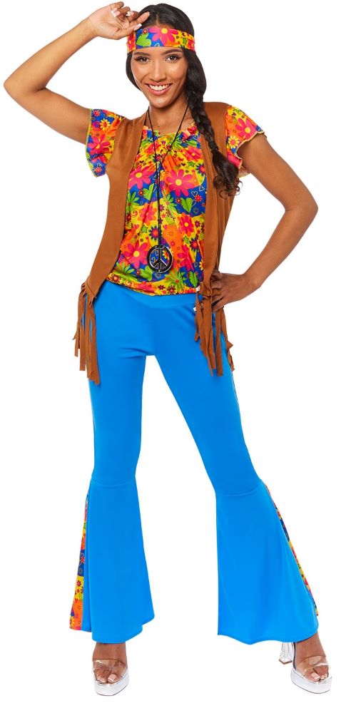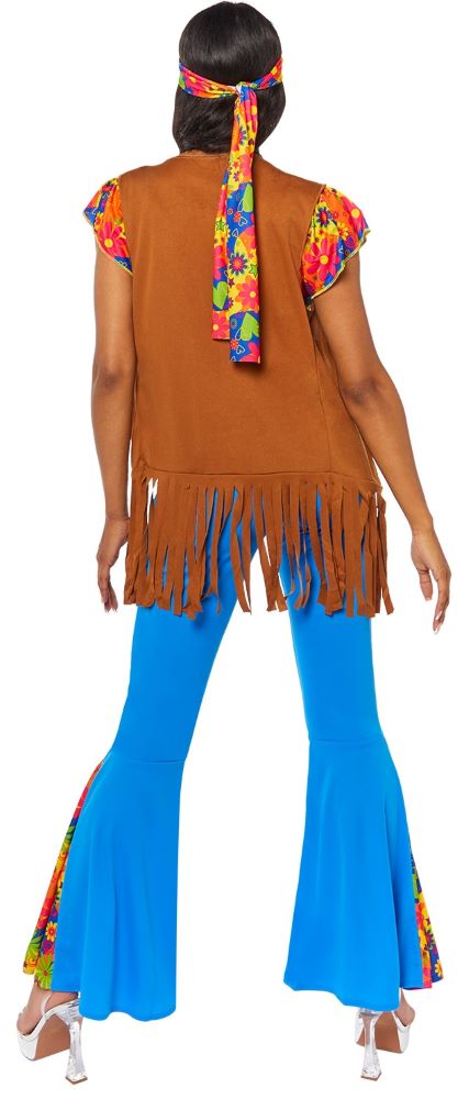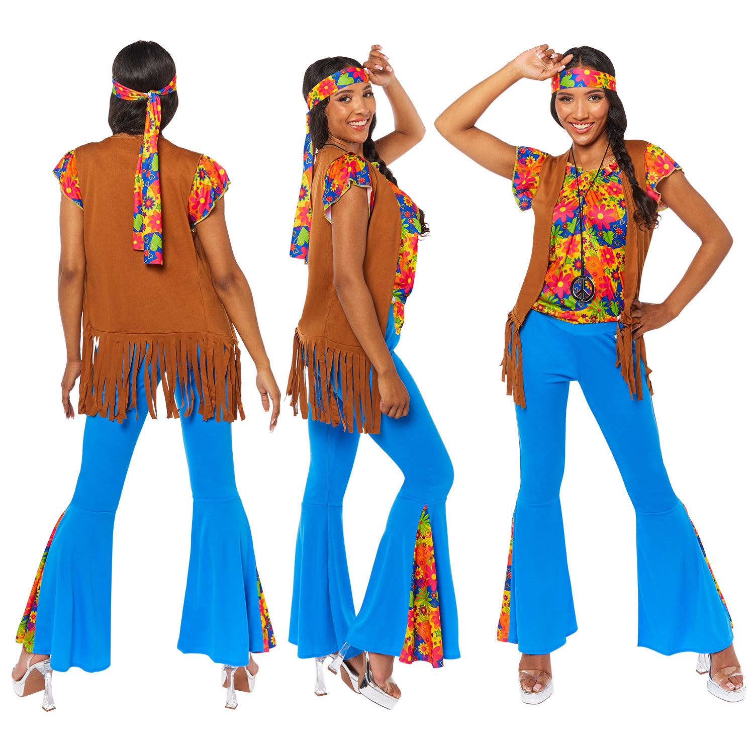 Das Hippie Girl Clair Damenkostüm besteht aus einem bunten, blumigen Oberteil mit angenähter Fransen-Weste, einer Hose mit Blumen-verziertem Schlag, einem passenden Stirnband sowie einer coolen Peace-Kette. Eine tolle Kostümierung für diverse Kostümveranstaltungen, wie Mottopartys und den Schlagermove.