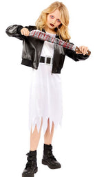 Ein weißes knielanges Kleid mit angenähtem Gürtel und die coole Jacke in Lederoptik, schon ist das Halloween-Outfit fertig. Mit coolen Boots, Machete und leichenblasser Schminke wird das Horror Braut Puppe Mädchen Kostüm für Halloween perfekt!.