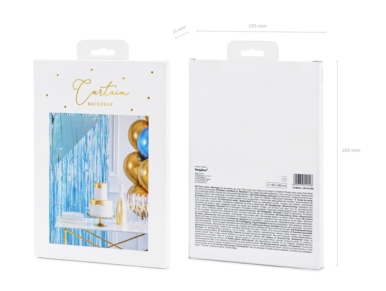 Dieser blaue Lametta Vorhang ist absoluter Allrounder: ob für Babypartys, magische Unterwasserwelten oder zu Silvester - er passt überall dazu. Er bildet beispielsweise einen hübschen Raumtrenner oder auch einen tollen Metallic-Foto-Hintergrund. Am oberen Ende befinden sich kleine Ösen, durch die eine Schnur zum Aufhängen gefädelt werden kann. Der Vorhang ist aber auch leicht mit Klebestreifen anzubringen und kann je nach Belieben selbstständig gekürzt werden. Die Maße sind 2,5m x 90cm.