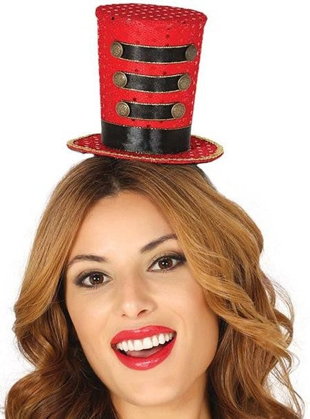 Der Mini Zylinder Zirkusdirektor auf Haarreif ist ein schickes Accessoire für Partys mit Zirkus Motto und andere Anlässe. Dank des Haarreifs sitzt der kleine, süße Hut perfekt auf dem Kopf.