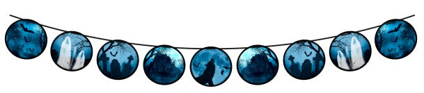Die Nacht des Grauens Girlande eignet sich perfekt, um den Gästen deiner Halloween-Party einen kalten Schauer über den Rücken laufen zu lassen. Die 2m lange Girlande ist in dunklen Blau- bis Schwarztönen gestaltet und mit vielen einzelnen, bebilderten und 17cm großen Wimpeln versehen. Die finsteren Motive, wie die wandernden Geister, der heulende Wolf oder die Weiten des dunklen Friedhofs, lassen erahnen, was in dieser Nacht so alles passieren könnte.