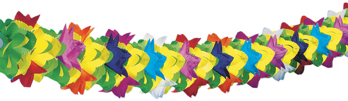 Wie eine tropische Blumenkette kommt die 6m lange Papier-Girlande Maui daher und verziert deine Partylocation. Die farbenfrohe Girlande in Blumen-Optik sorgt für fröhliche Stimmung bei sommerlichen Partys.