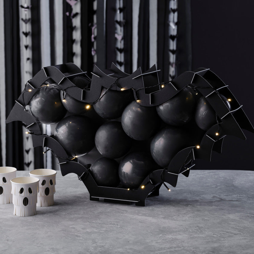 Was sehen meine Augen, eine riesige Fledermaus... in etwa so, könnten deine Partygäste auf diesen coolen Dekoartikel reagieren. Setze ganz einfach das Stecksystem wie in der mitgelieferten Beschreibung angegeben zusammen und erwecke so den schaurigen Fledermaus Ballonstand zum Leben. Durch die mitgelieferte Lichterkette kannst du ganz individuell Lichteffekte schaffen und den Ballonstand beispielsweise als Beleuchtung für dein Buffet, oder den Eingangsbereich zu deiner Feier nutzen.