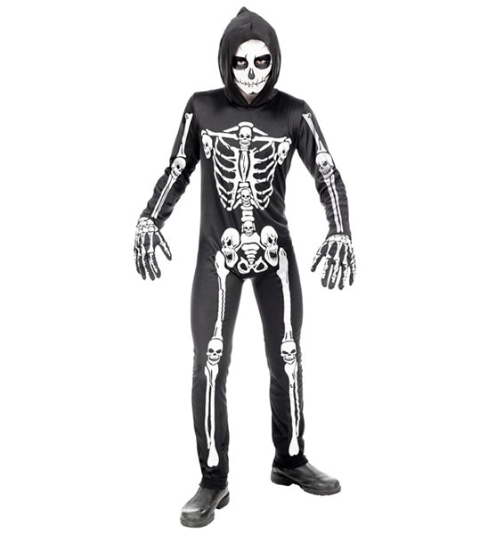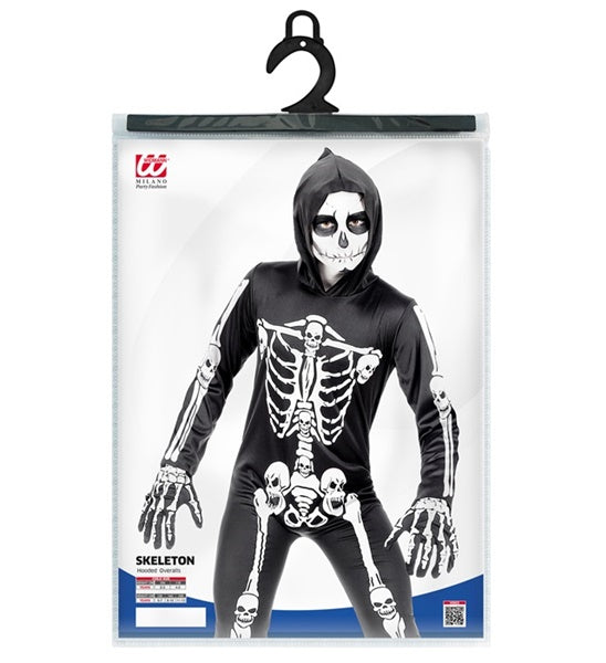 Der Schauriges Skelett Overall für Kinder besteht aus einem schwarzen Overall mit weißem Skelettaufdruck. An den Gelenken befinden sich überall kleine Totenköpfe, die den Overall so einzigartig machen. Einfach den Overall an Halloween anziehen und schon kann es losgehen.