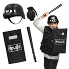 Das SWAT Police Set 4-teilig besteht aus dem Helm mit SWAT Aufschrift, dem Knüppel, dem Schild mit Police Aufschrift sowie der Handgranaten Attrappe.