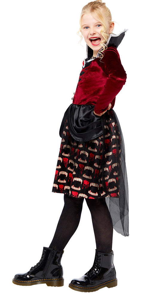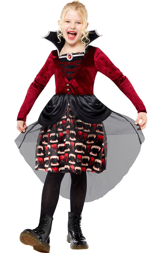 Hübsch gruselig verkleidet zur Halloweenparty mit dem Vampir Prinzessin Ella Mädchenkostüm! Das Kostüm besteht aus einem rubinroten Kleid mit Kragen und schwarzem Tüllrock.