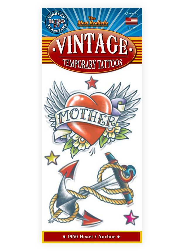 Die Vintage Klebe-Tattoos im Schiffer-Stil lassen sich kinderleicht auftragen und mit Wasser und Seife auch wieder entfernen. Verpackungshöhe: 22cm.